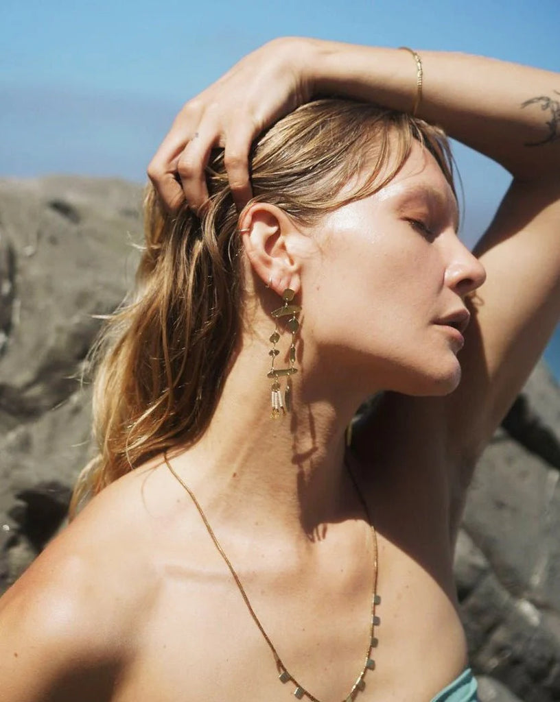 Inspired by a mobile made of drift wood from the California coast, these earrings catch the light when worn. A splash of color from glass beads.