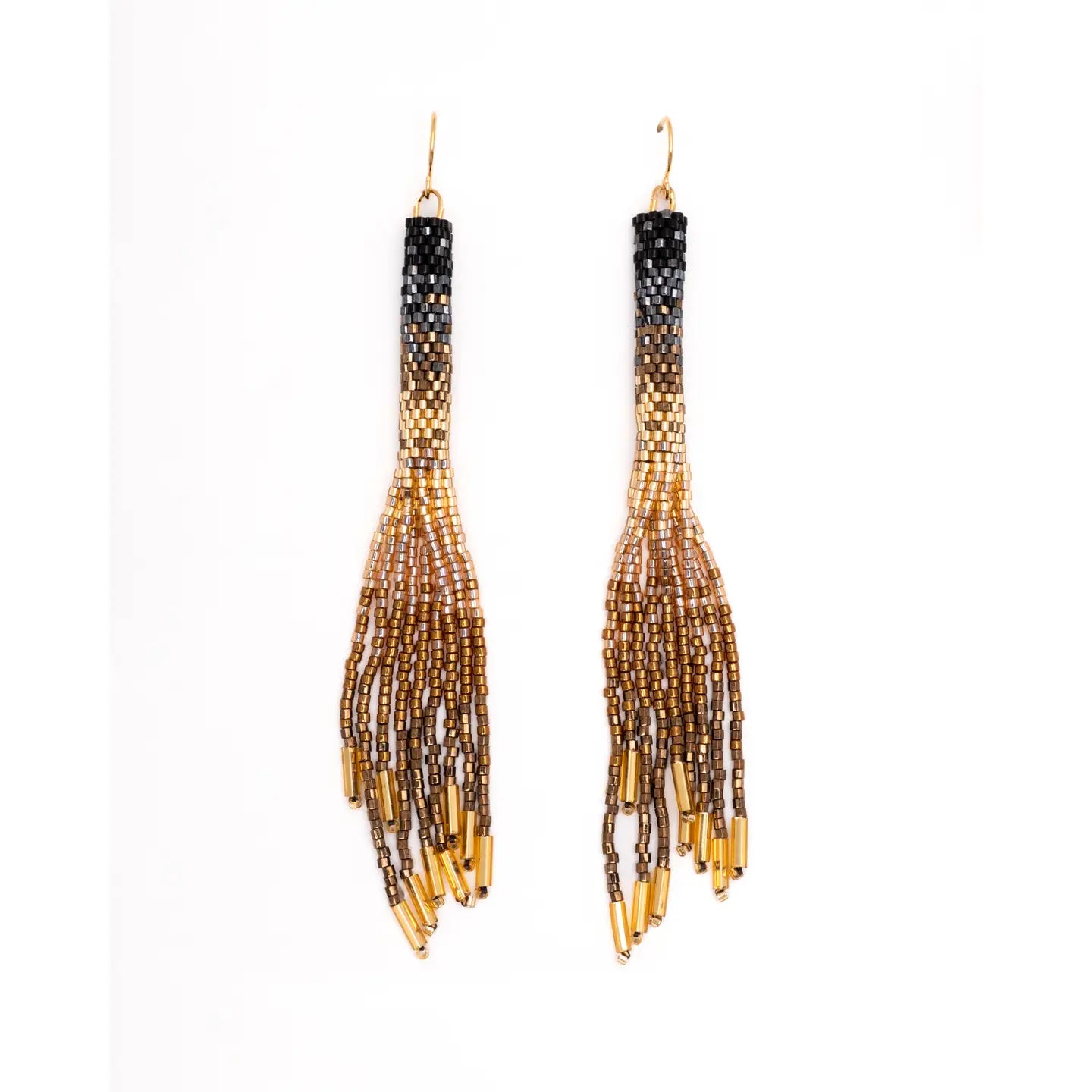 Glamorous and fun, these ombre tassel fringe earrings are perfect for a night out or a special event. With beautiful ombre jewel tones and fringe finished in light catching tube beads, these will surely turn heads. Their length adds a dramatic effect, but they are lightweight, easy to wear all day, and have great movement.