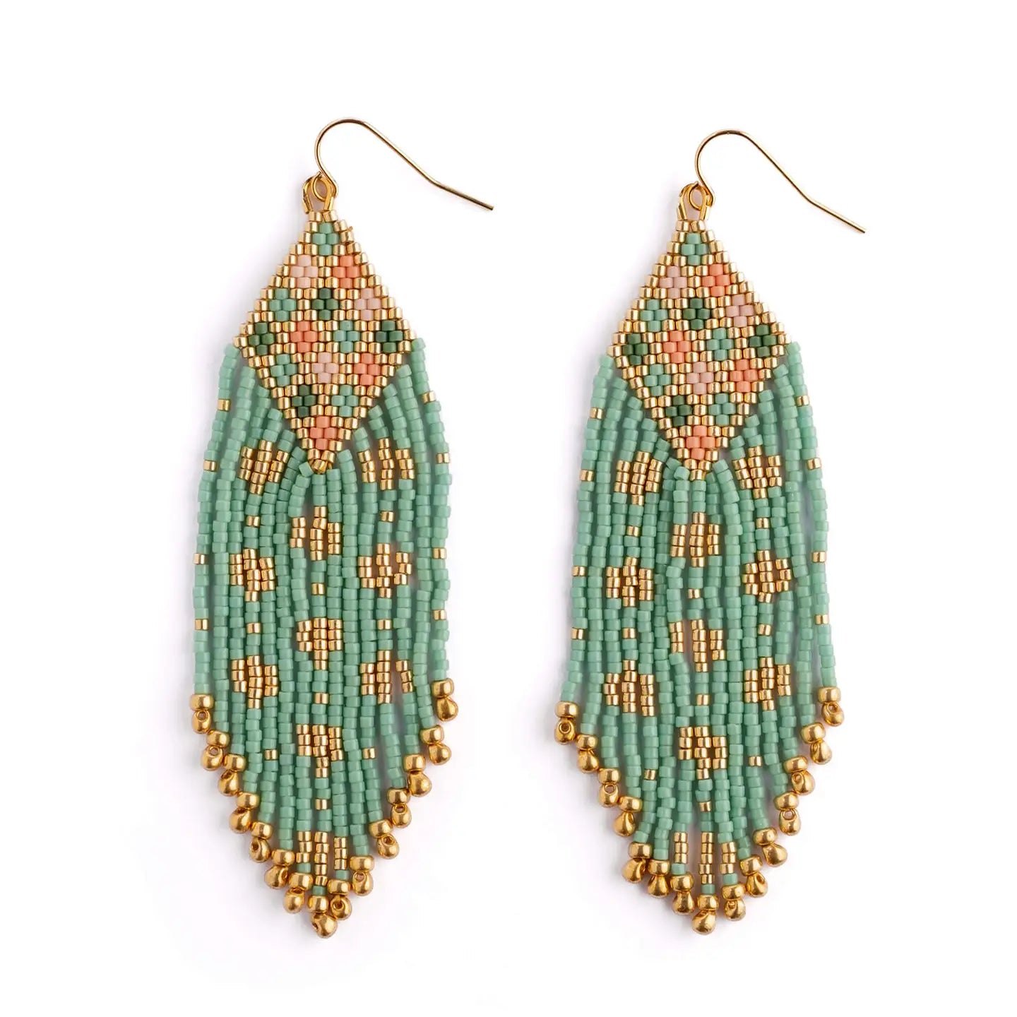 Inspired by the intricate patterns and rich textures of traditional Indian sari textiles, these handwoven earrings feature a geometric diamond motif paired with cascading beaded fringe dotted with gold. Crafted with high-quality Japanese glass beads, the design offers graceful movement and a refined bohemian feel.