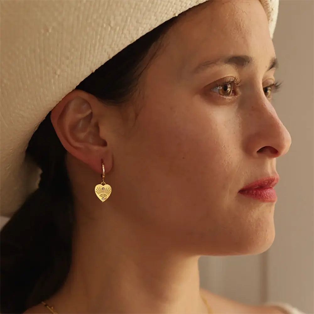The symbol of a heart with an eye means love and protection for the one who wears it. These a unique Valentine's gift and they stack easily with other earrings. Made of 14k gold plated brass with Czech crystal. Designed and assembled in our Sonoma California studio.