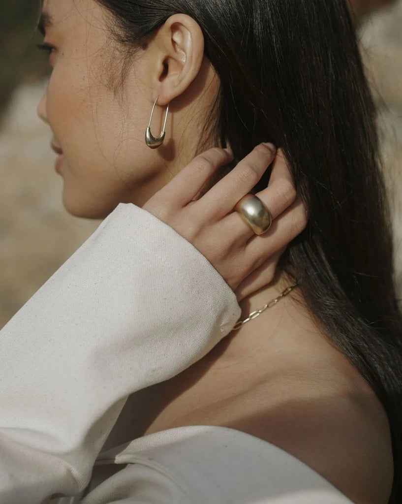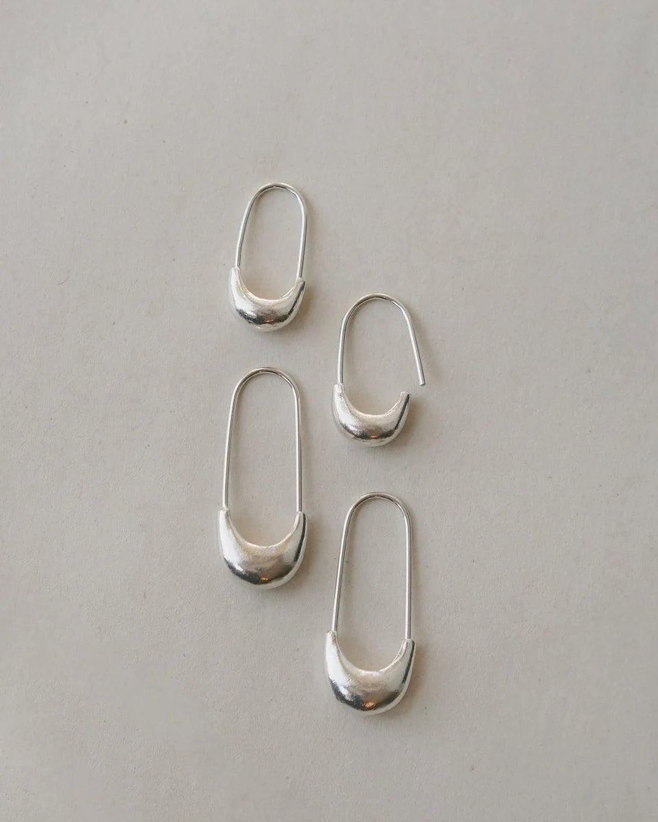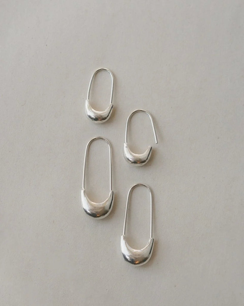 Smooth and simple, these earrings will soon become your go to earring. Like a safety pin, the ear wire locks in place. The perfect earring to wear with a mask.
