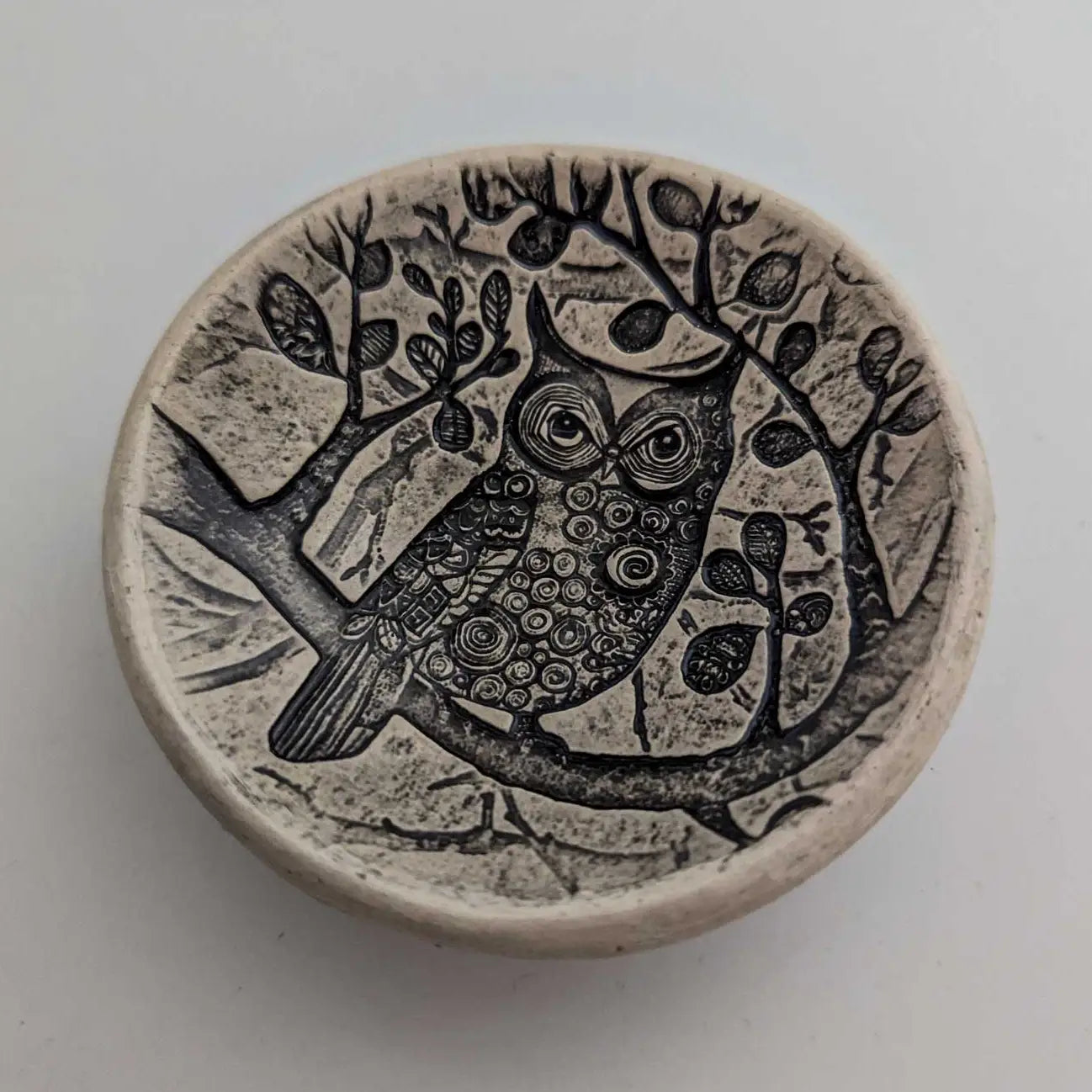 This round shaped ceramic bowl is made from earthenware clay and features an owl in the forest. The dish is decorated with food-safe shiny black underglaze.