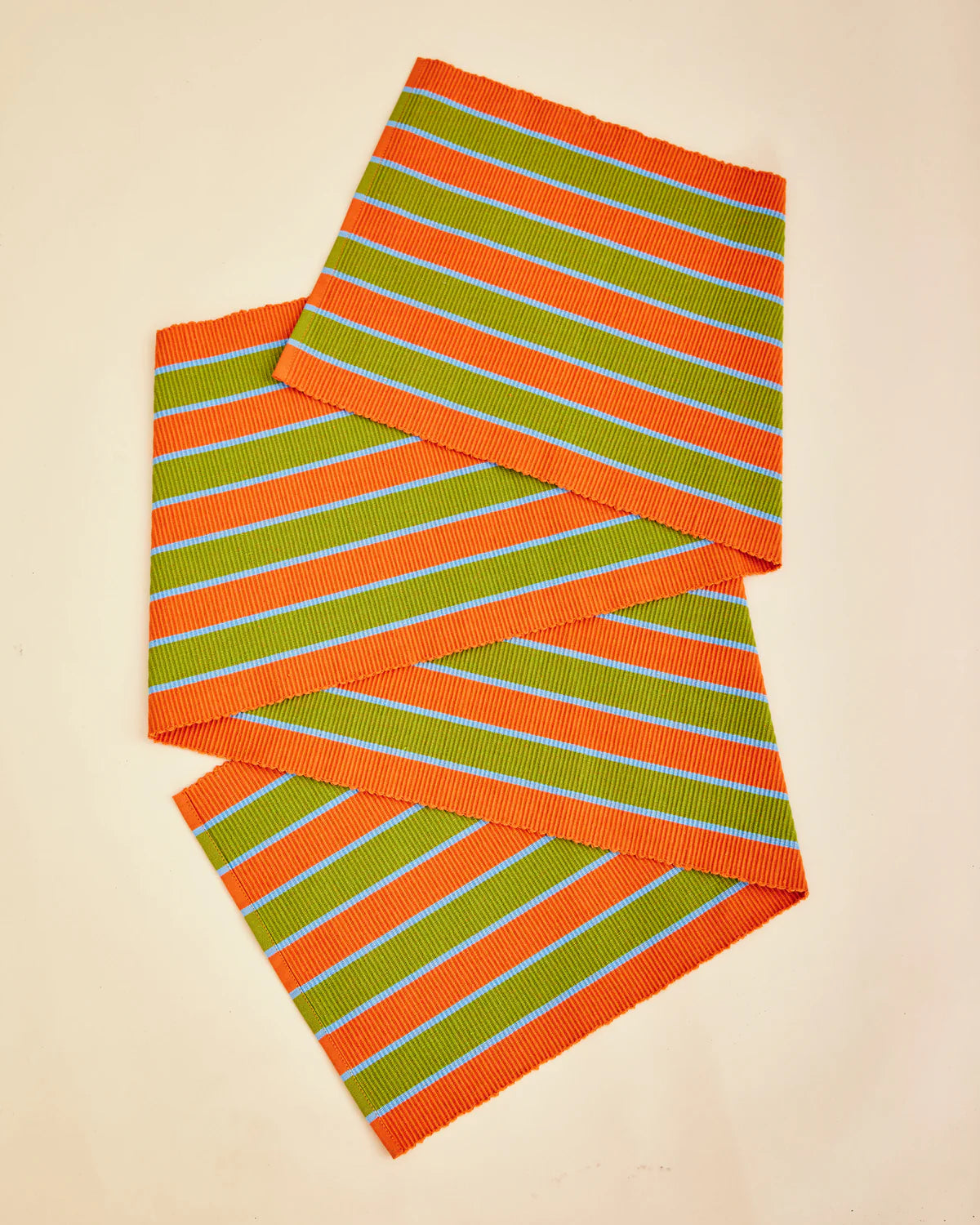 Runner in orange, green, and blue Saffron Stripe. Cotton runner in tri-color stripes with a ribbed texture. 100% cotton. Made in India.