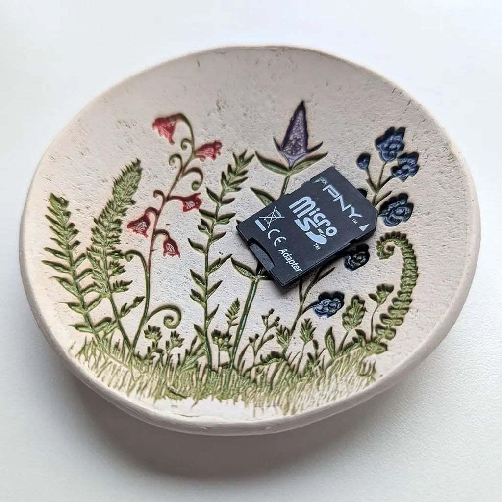 This round shaped ceramic bowl is handmade from earthenware clay, underglazed in green, and features a multicolored wildflower scene in red, purple, and blue.