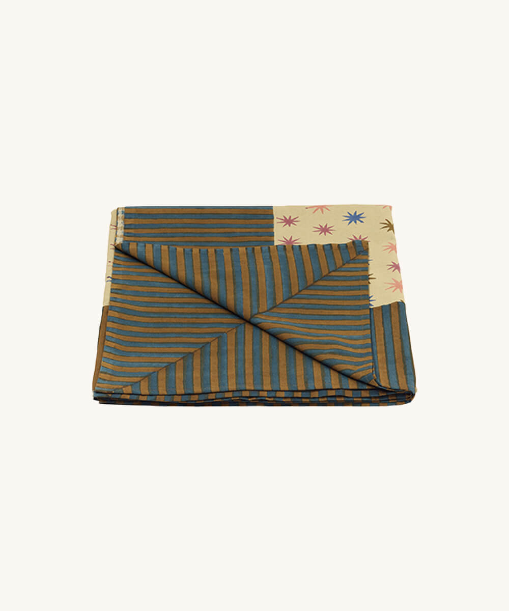 Looking for the perfect festive tablecloth for your extra-long table? The Noa Star Table Throw is just what you need for your entertaining needs. Designed for extra-long tables, this table throw measures an impressive 63 x 138 inches, making it ideal for grand dining settings and large gatherings. This throw features a playful pattern of colorful stars on a warm beige background, accented with bold stripes for a striking contrast. Hand block-printed by our skilled craftsmen in India using wooden blocks on 100% cotton, each piece is unique.