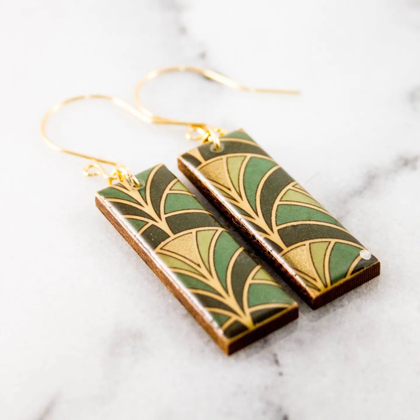 Deco Fan Rectangle Earrings, Green/Gold