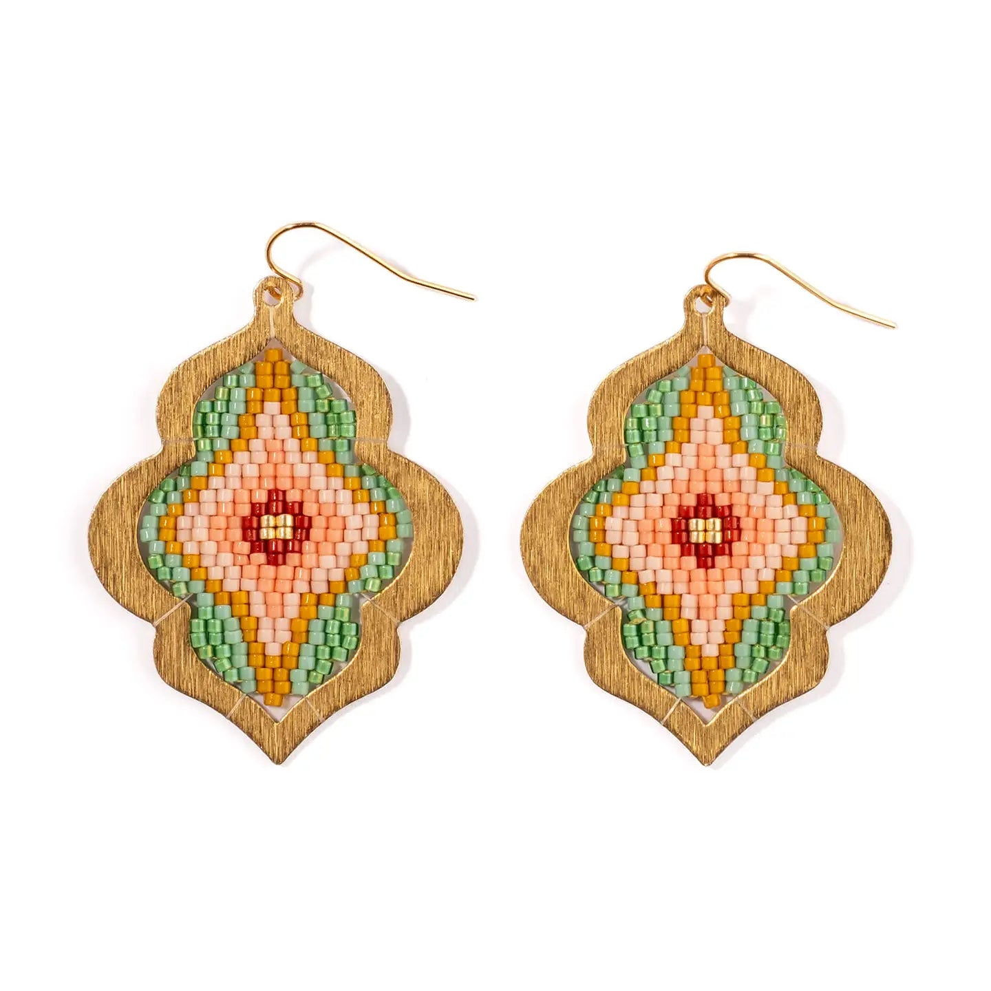 These handwoven statement earrings feature a nod to the cusped arched windows found in Indian architecture. Meticulously crafted with premium Japanese Miyuki glass beads, the design centers on concentric fluid forms of contrasting colors that are framed inside a scalloped brass silhouette.