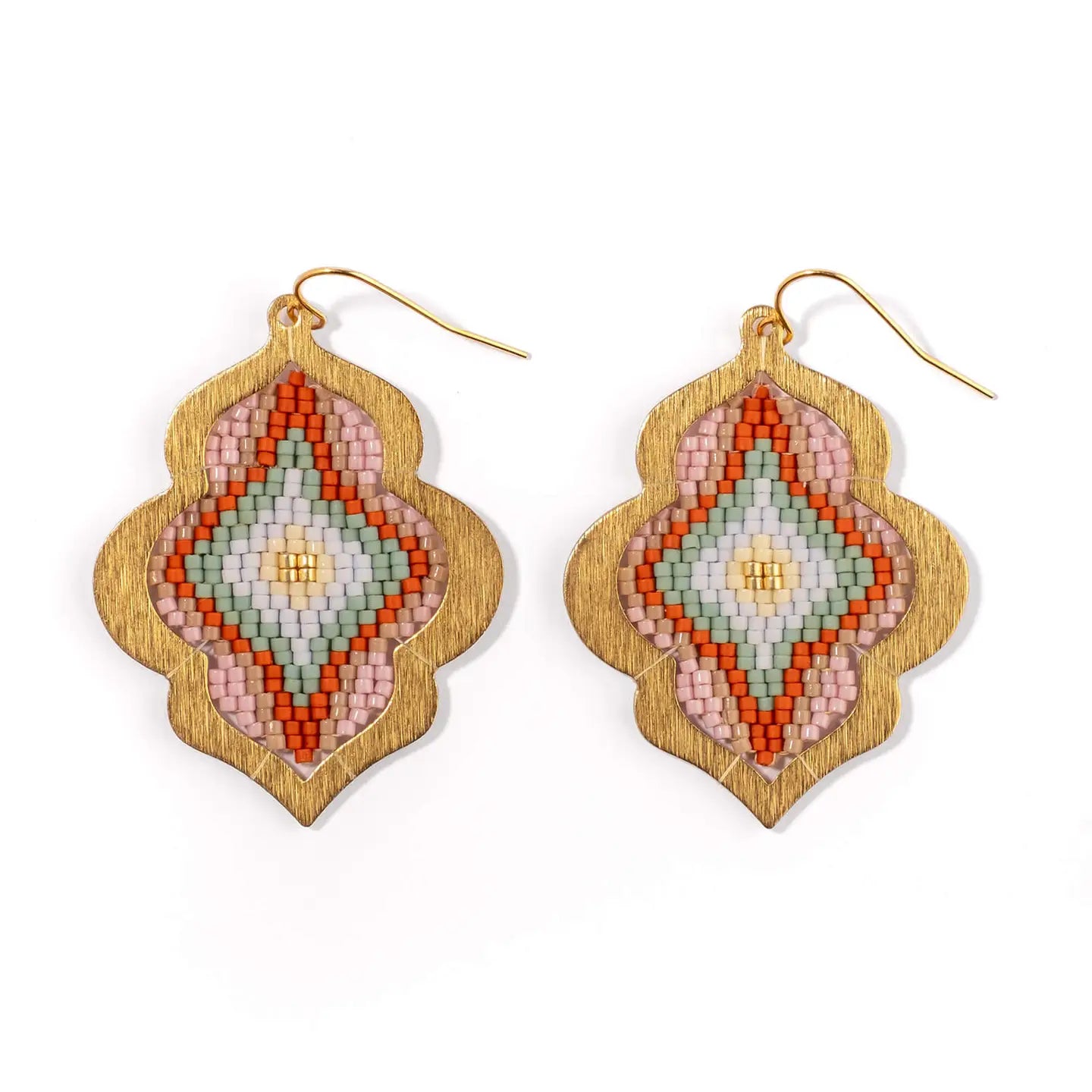 These handwoven statement earrings feature a nod to the cusped arched windows found in Indian architecture. Meticulously crafted with premium Japanese Miyuki glass beads, the design centers on concentric fluid forms of contrasting colors that are framed inside a scalloped brass silhouette.