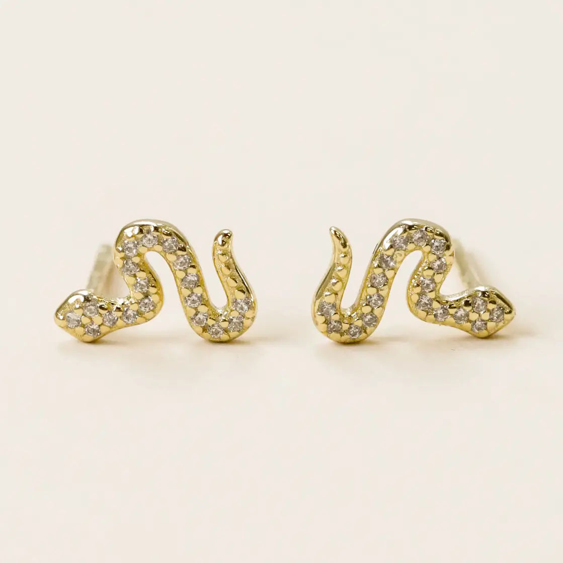 A small snake with white CZ stones. Tarnish Free - Long lasting protective coating safeguarding your jewelry from sweat, water, and more. Sterling Silver Posts – 18K gold plating over brass Hypoallergenic – Lead Free