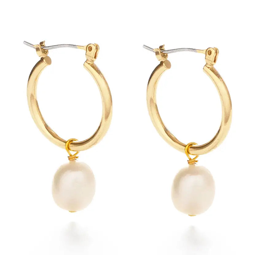 These stunners are so elegant and perfect for day or night. 10mm freshwater pearls hang from hoops that measure .75" diameter. They have surgical steel ear wires and are the hoops are made of brass and plated in 14k gold. Designed and assembled in our Sonoma California studio.