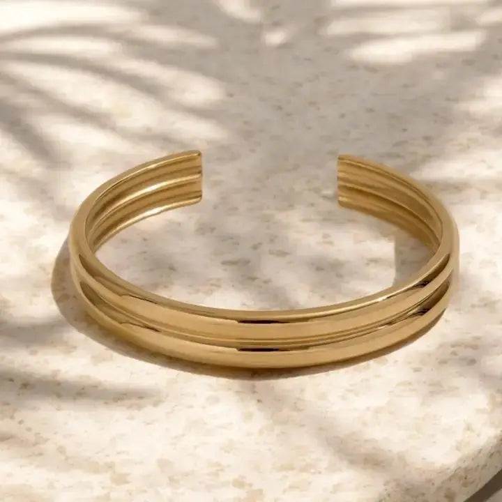 The Sofia Cuff: Double-layered gold bangle with a modern, sophisticated design—perfect for adding a subtle statement to any outfit