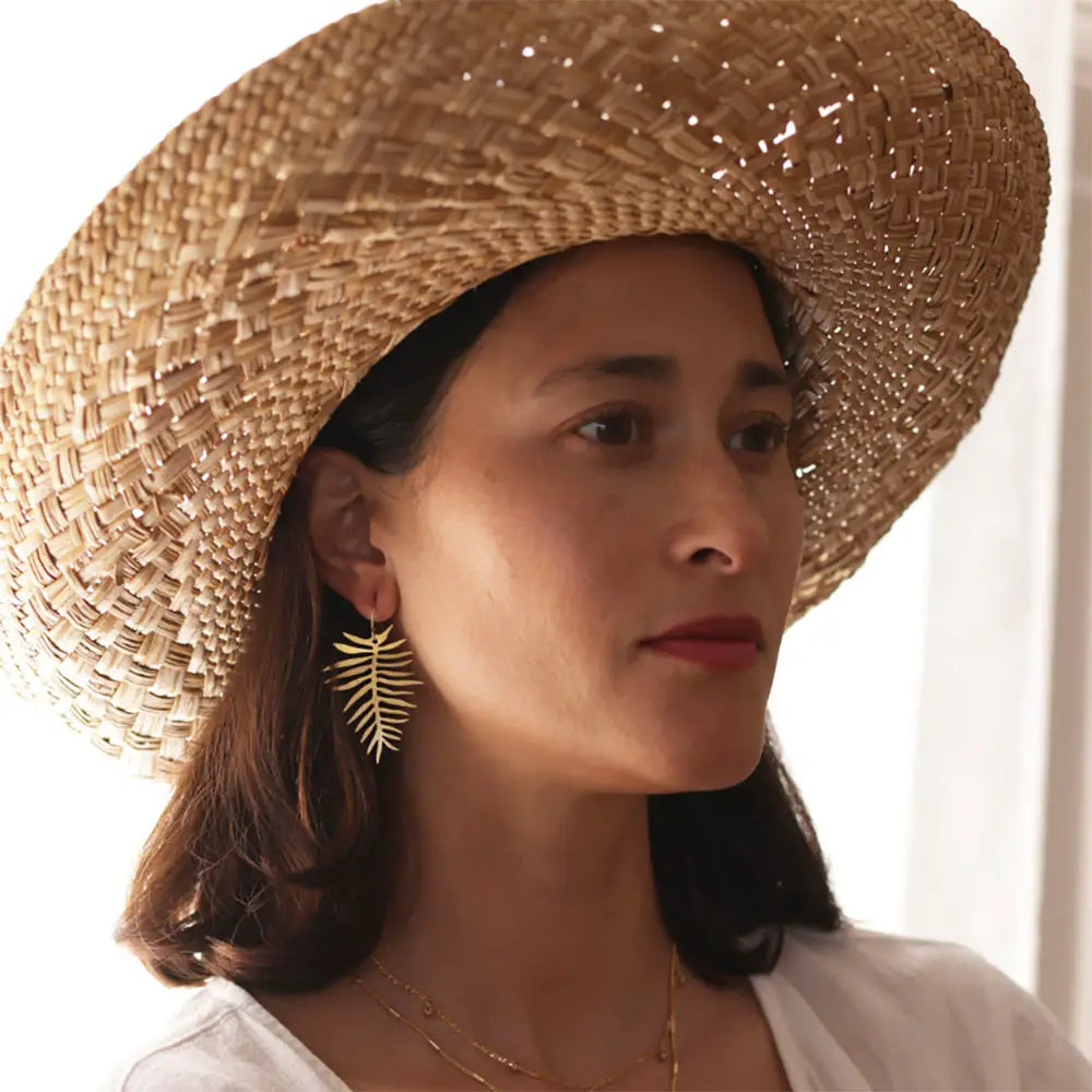 We are taking a dip into the world of botanicals and loving the tropical flora. The Areca palm leaves measure 2" and are made of 14k gold plated brass with a matte finish. They hang from 14k gold fill ear wires. Designed and assembled in our Sonoma California studio.