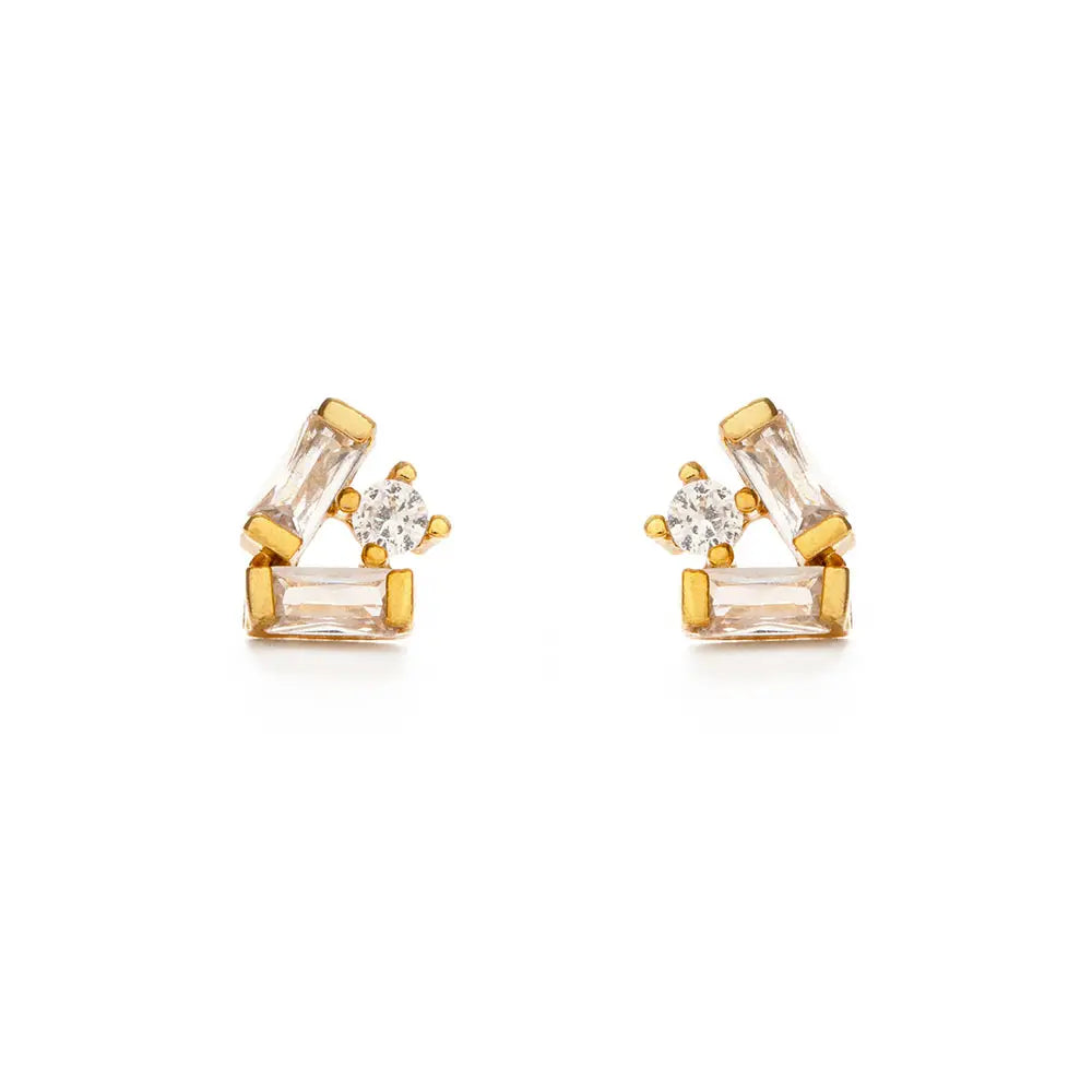 Classic style with a contemporary appeal. A great ear stacking style that is also a sleek minimalist look. Two tiny baguette crystals clustered with a single CZ stone. 14k gold plated brass setting. Lead and nickel free. Designed in our Sonoma California studio.