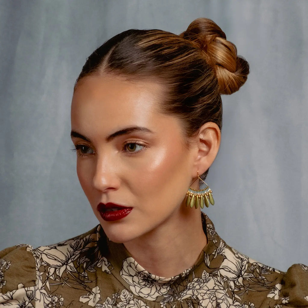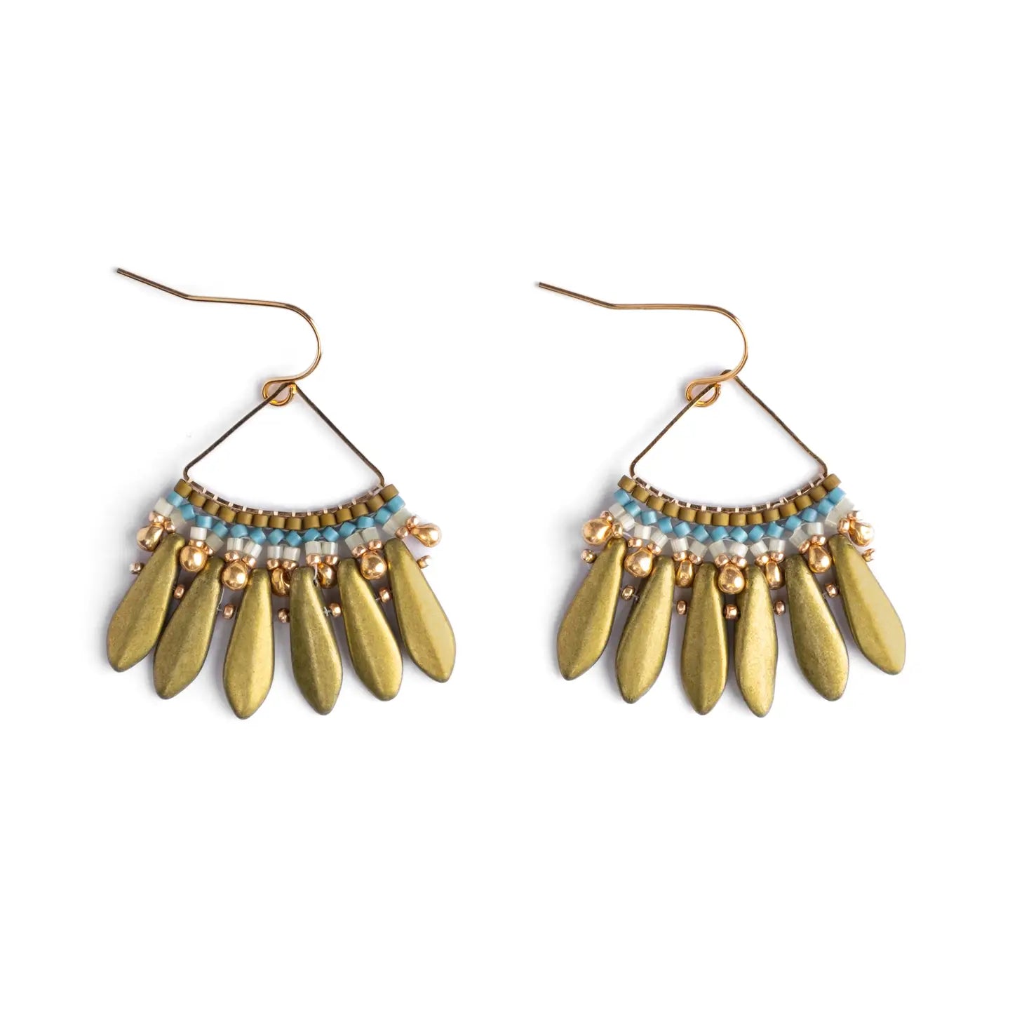 Woven on a geometric gold-plated frame, these earrings feature metallic-finished Czech dagger beads combined with Miyuki glass beads to form an elegant fan-shaped dangle. Spotted with gold beads for added sparkle, these earrings are lightweight and full of bold colors, making them the perfect pair to add a playful touch to any look whether casual or dressy.