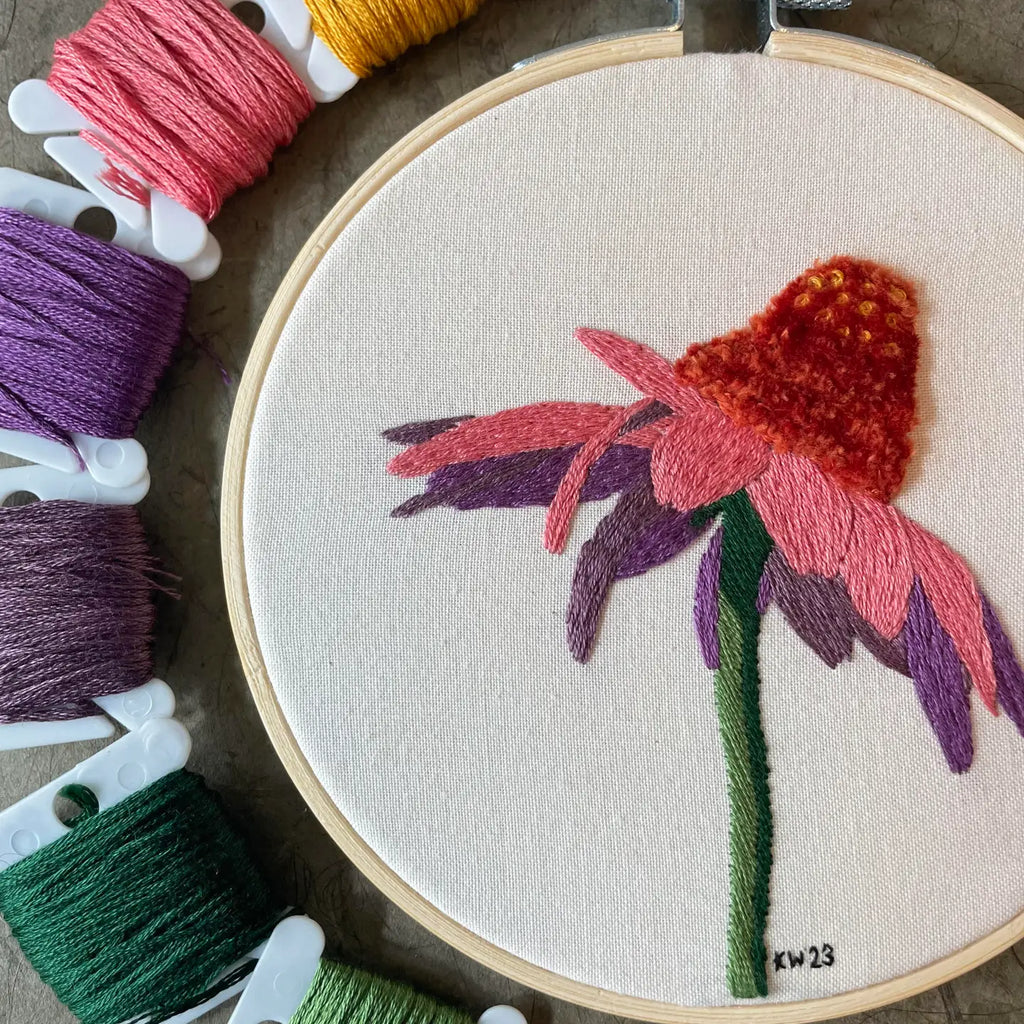 Stitch this fun coneflower and expand your embroidery stitch bank by learning the turkey stitch, an advanced stitch using rows of loops that are cut afterwards to create a fuzzy texture! This kit includes 7 DMC floss colors and is 5" in diameter. The instructions assume someone is a complete beginner and include step by step tutorials and links to videos on how to do the stitches included in this pattern: French knots, satin stitch, split stitch, and turkey stitch. With the pattern already printed on the fabric, it's paint by numbers...but with thread!