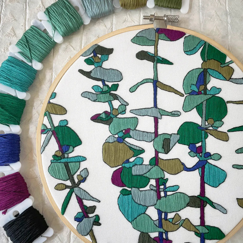 Eucalyptus is often associated with calm, clarity, and renewal—making it a perfect subject for a relaxing stitching project. As you fill in each section with satin stitch, it’s almost like you can smell the fresh, soothing scent of eucalyptus in the air.