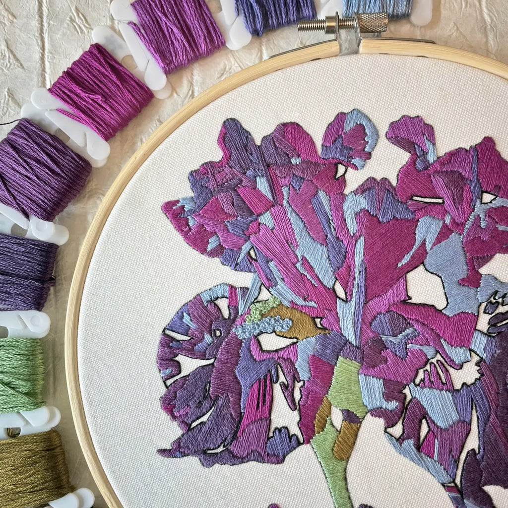 Bring a bold purple iris to life with this DIY embroidery kit. The 8" paint-by-numbers-style design uses 9 rich DMC floss colors to capture the bloom’s layered, shifting tones.