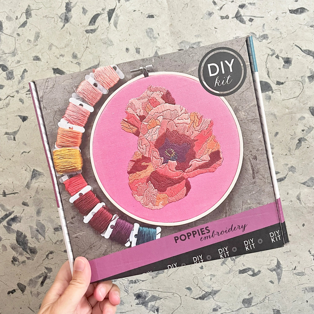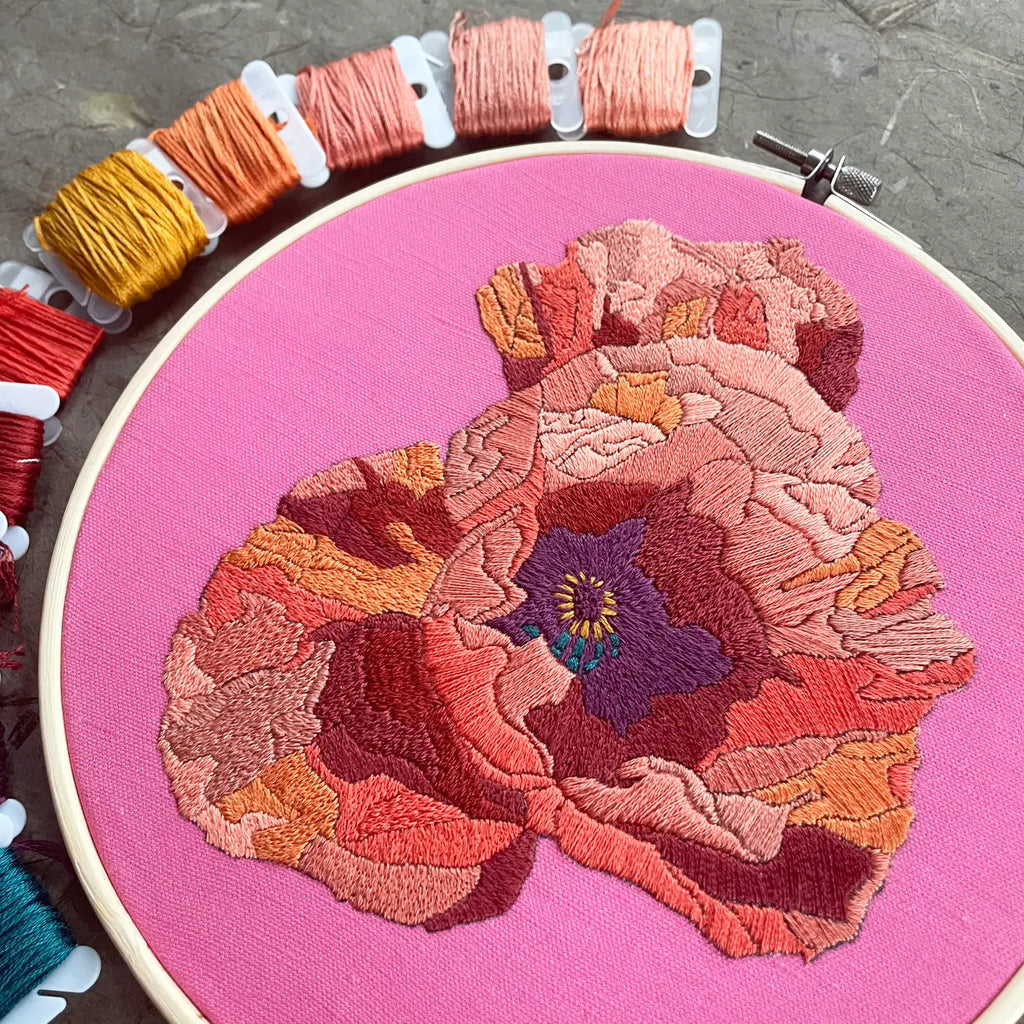 Celebrate the vibrant beauty of a poppy with this exquisite embroidery kit. Set against a striking pink background, this 8" design is showcased on a full-color printed fabric and brought to life through 10 carefully selected DMC floss colors that capture the flower’s rich depth and delicate nuances.