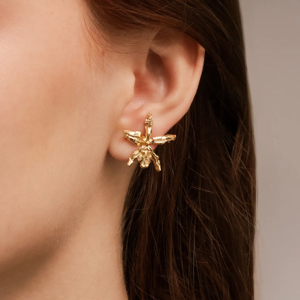 These delicate orchid-shaped stud earrings feature a slightly textured three-dimensional effect which gives them a realistic look. They are perfect to wear day-to-day. Plated in 24K gold and handmade by artisans in Colombia.