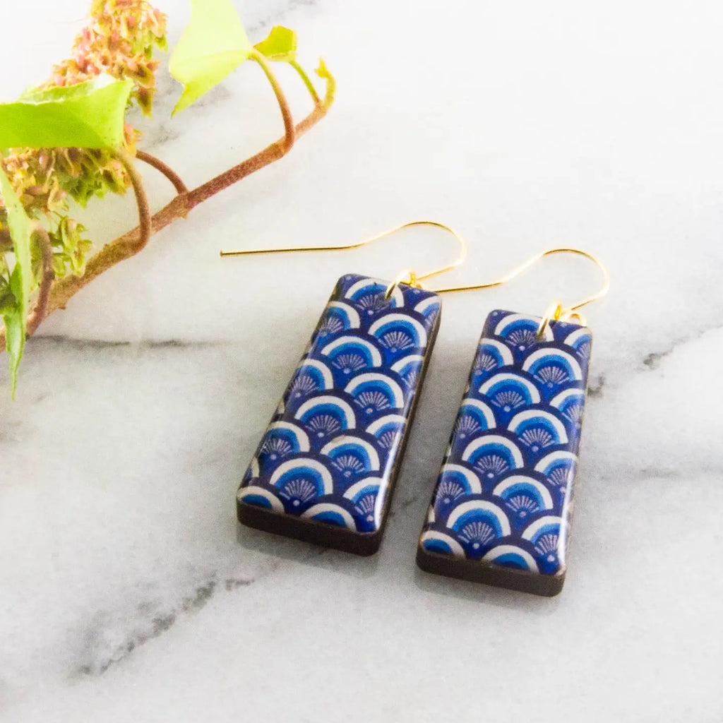 These delightful earrings perfectly capture the spirit of sea! Featuring a Japanese inspired fish scale pattern, rendered in vivid blue shades and white.