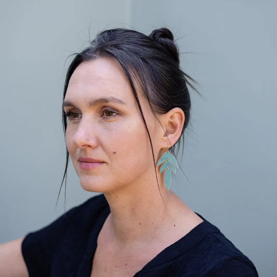 The Palma Earrings are the larger version of our Palmita Earrings and feature a cascade of hand cut leaflets. The earrings are created with hand cut leaflets with my signature hammered finish. Striking in appearance and amazingly light and easy to wear. Available in brass, silver or gold fill in addition to two patina finishes.