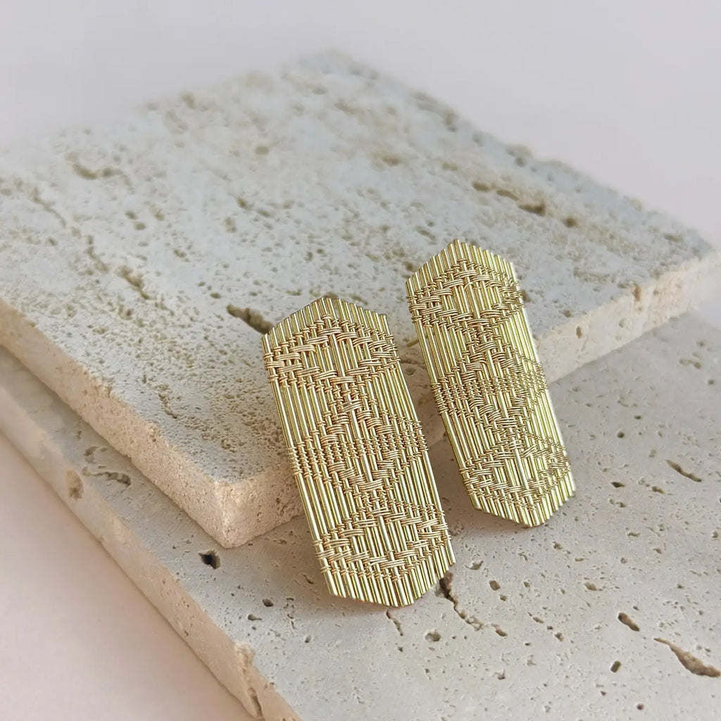 These truly one-of-a-kind earrings are formed exclusively with intricate wire wrapping techniques, which puts them in a unique category of jewelry that requires no soldering or casting, making them eco-friendly and lightweight. Using high-quality gold-plated wire, highly skilled artisans weave the materials together to create a striking geometric pattern within the earring. The earring post is made using the same gold-plated wire as used in the earring.