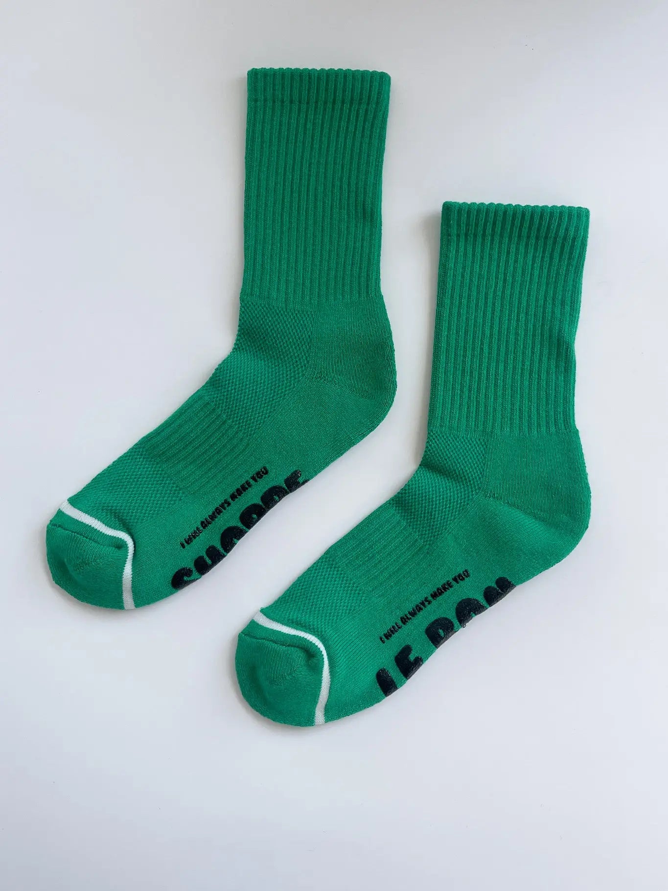 The introvert with a bubbly personality. Say hi to the Hugger Socks. Built on the same classic crew-length base as the Boyfriend Socks, with a clean, solid leg and a playful surprise underneath. A silicone motif on the sole adds a light grip, perfect for hugging flats, clogs, and slides.