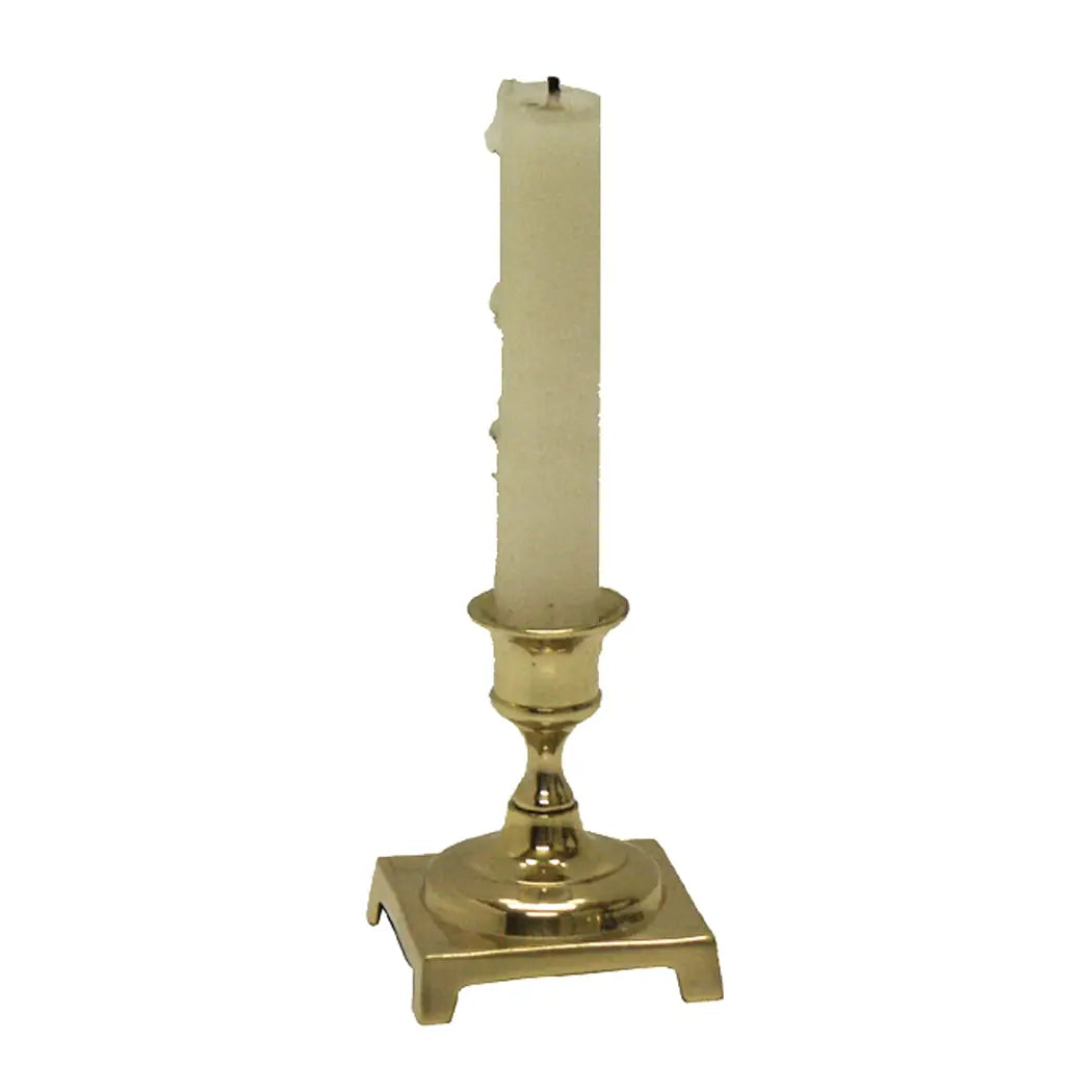 This delicate and elegant, solid brass brass candle holder with a square, footed base is perfect for inside lanterns or hurricanes, complements any colonial or historic home decor theme or style and dresses up any formal table setting,