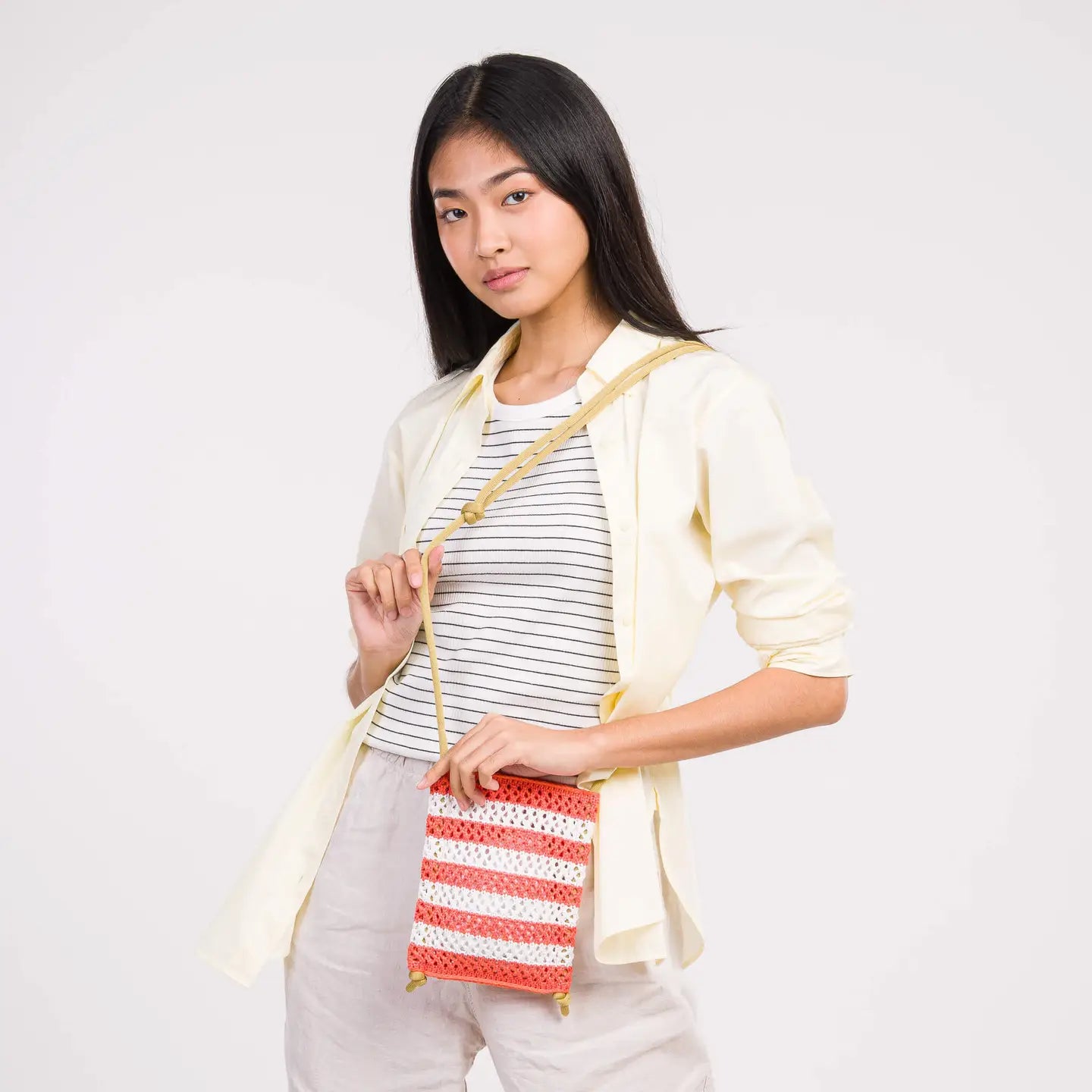 Easy, minimal, and bright striped phone sling made from raffia and yarn. Layer with your favorite bag, or wear it alone for a super streamlined fit. Sturdy crochet-style knit construction. Adjustable strap is made from repurposed yarn-stuffed cord and can be worn long or short for extra versatility.
