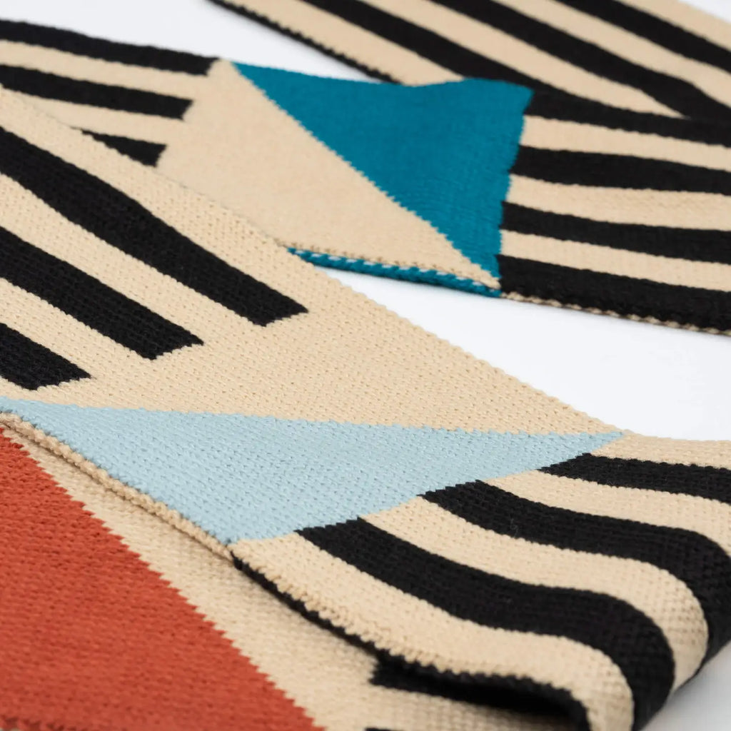 A vintage-inspired long skinny scarf knitted with alternating blocks of triangles and stripes. Colorful, reversible, and unisex. For indoor and outdoor wear. Can be tied and wrapped in many different ways depending on weather or mood. Knit with new and repurposed deadstock yarn.
