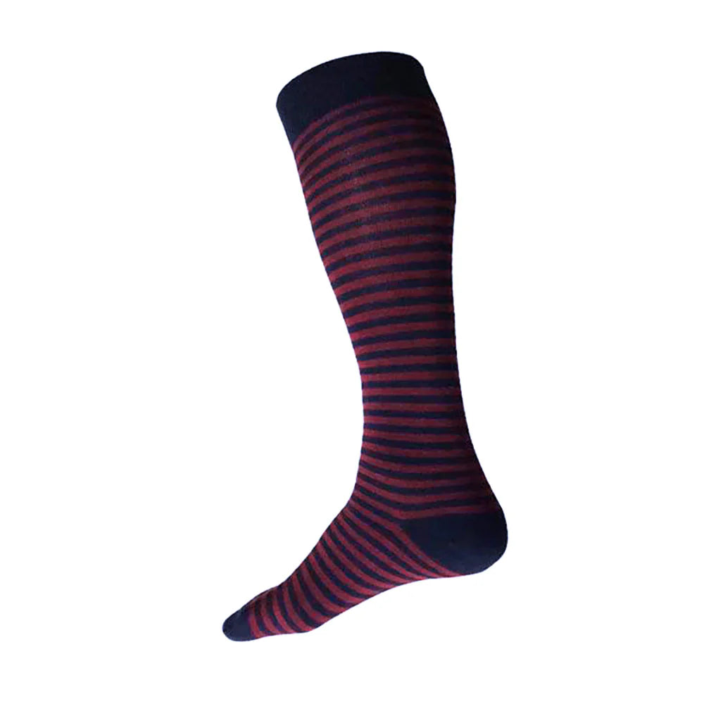 For folks who like full leg coverage and cozy support, here are true over-the-calf/knee socks in navy with burgundy stripes!
