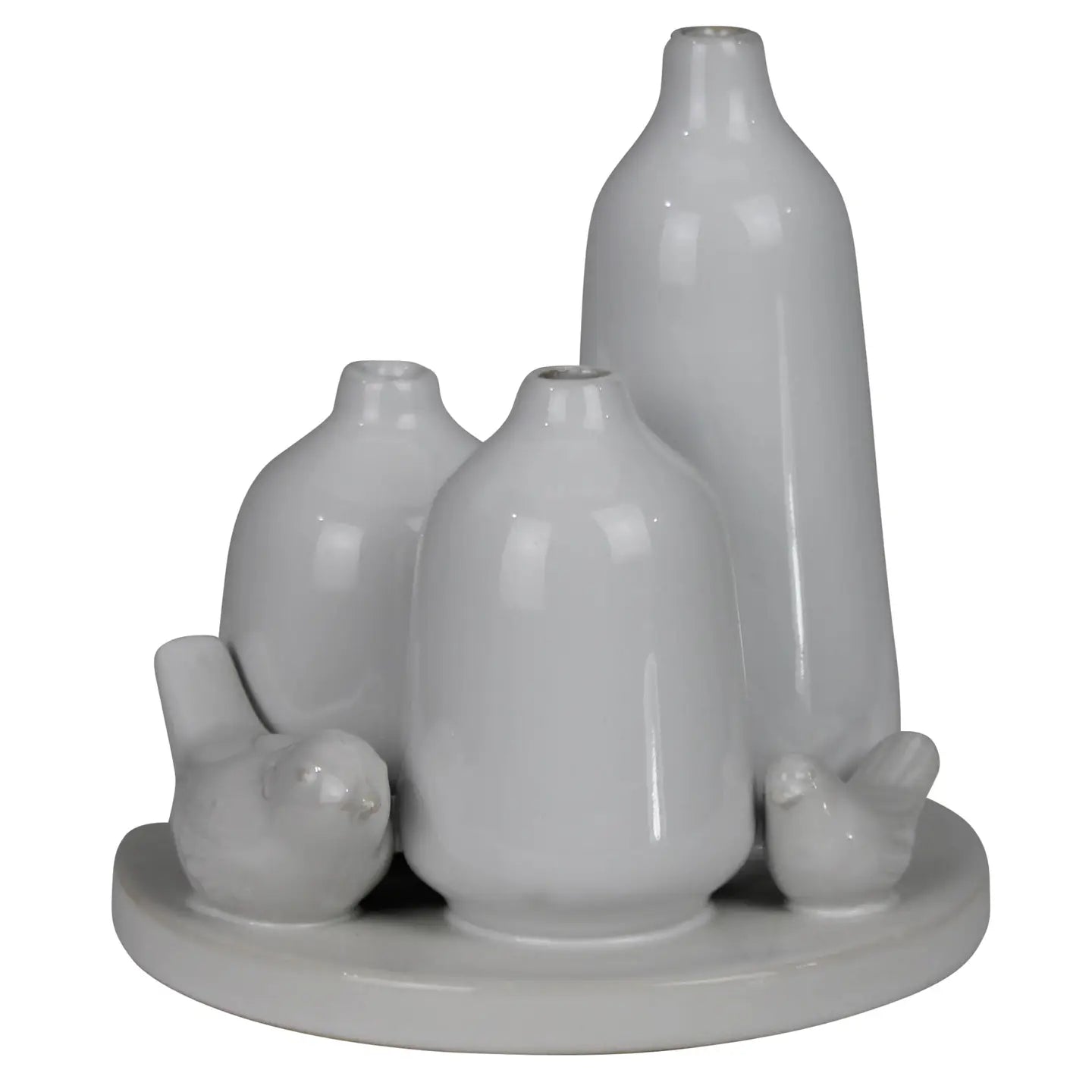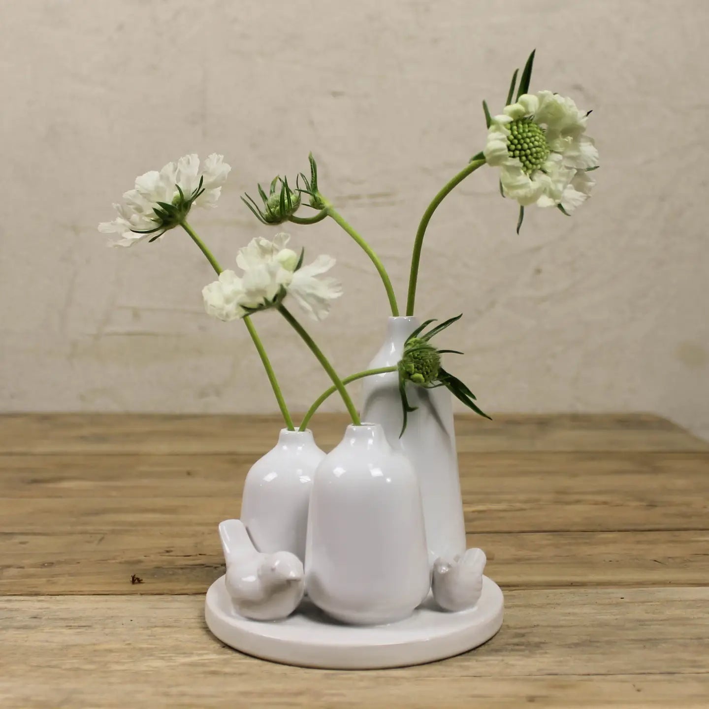 Matte white ceramic cluster of 3 vases, featuring two small bird figures perched delicately atop. Their minimalist design and subtle bird accents create a serene, nature-inspired display, perfect for adding a peaceful, artistic touch to any room.