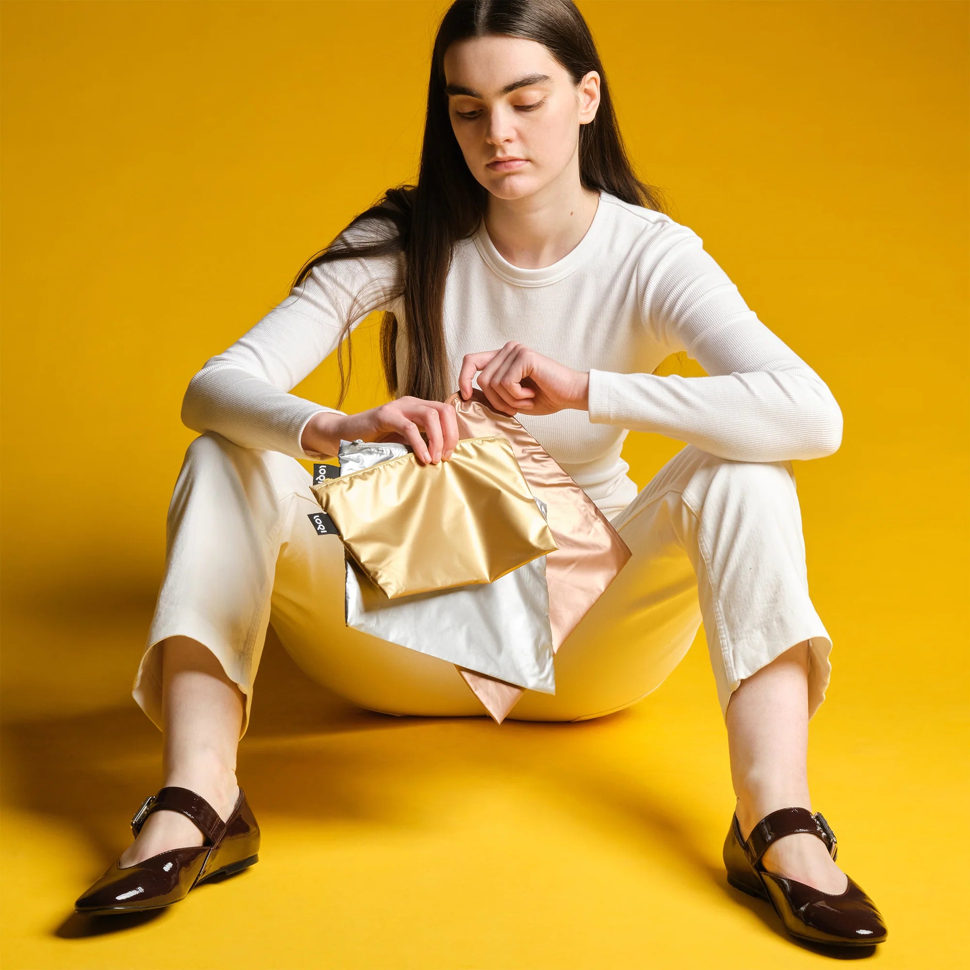 Glamazon gold. Sparkling silver. Radiant golden rose. Embrace the magic of metallic with zip pockets that let you tote your valuables and invaluables like a true superhero, powered by style and sparkle.